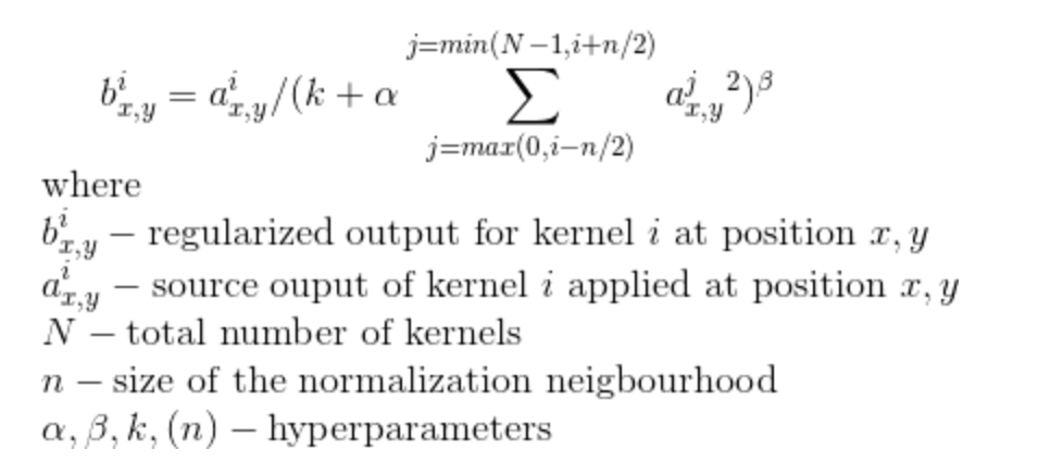 텐서플로우에서 LRN을 사용하려면 tf.nn.local_response_normalization을 통해 사용할 수 있지만 현재는 Batch Normalization을 사용합니다. 조금 더 깊게 공부하고 싶으신분은 아래 공식을 보시면 될 것 같습니다.