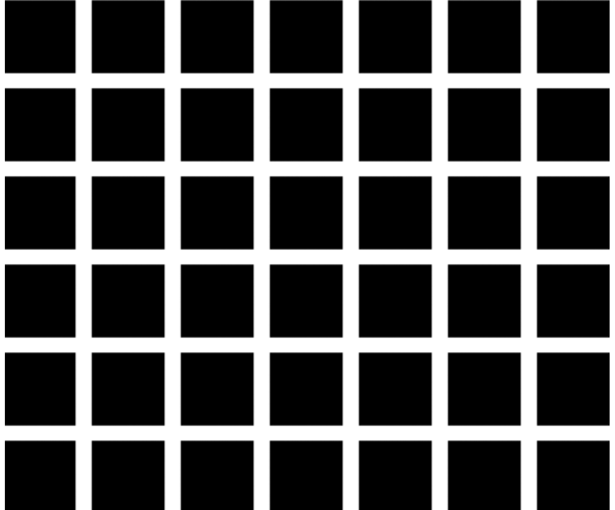 검은사각형안에 흰색의 선이 지나가고 있습니다. 신기한 것은 흰색의 선에 집중하지 않을 때 회색의 점이 보이는데 이러한 현상이 측면 억제(lateral inhibition)에 의해 발생하는 것 입니다. 이는 흰색으로 둘러싸인 측면에서 억제를 발생시키기 때문에 흰색이 더 반감되어 보입니다.