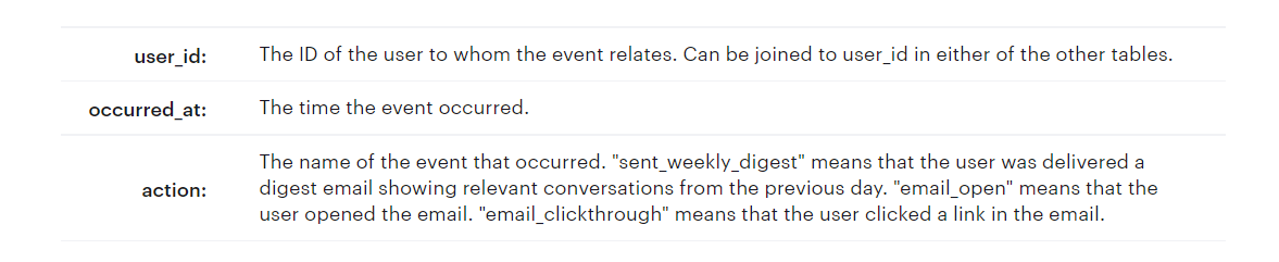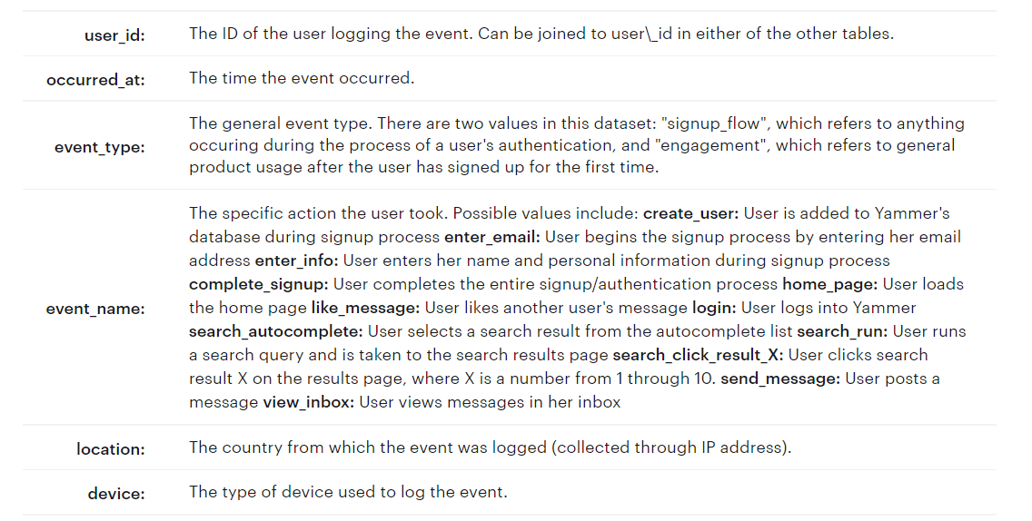 This table includes one row per event, where an event is an action that a user has taken on Yammer. These events include login events, messaging events, search events, events logged as users progress through a signup funnel, events around received emails.