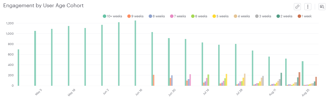 코호트 분석은 사용자를 그룹으로 분류하여 그룹의 행동과 유지율을 분석할 때 활용하는 기법입니다. 아래 차트를 보게 되면 가입기간이 10주 이상인 유저의 engagement가 감소함을 볼 수 있습니다.